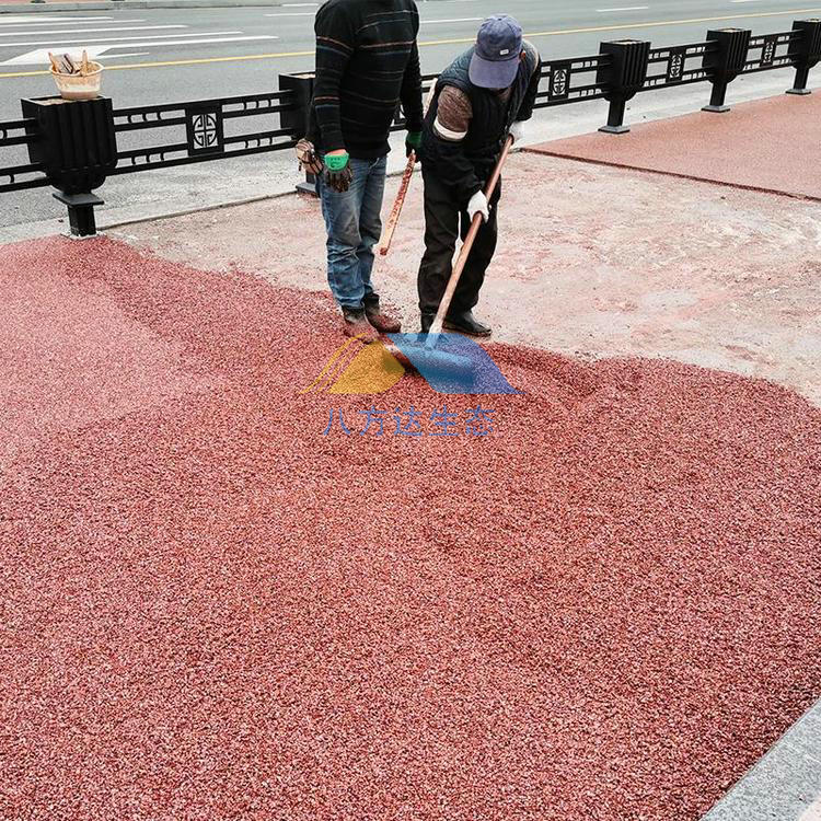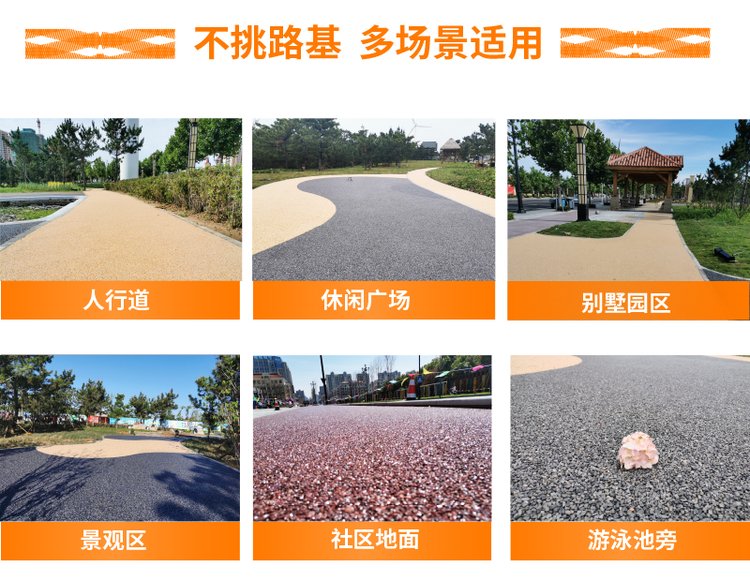 3、施工场地要求:透水胶粘石用做承载性路面,所以在基层的选择上也是非常讲究的,大多会选用水泥路面.或者透水混凝土路面等硬化后的路面均可,一般胶粘石路面设计为2--4公分厚居多。一般不建议直接做在素土的基础上,因透水胶粘石的透水率很高,素土层基!础容易因长期水流路径改变路面的承压能力。其中如果用作树池,可以做在素土基础上。施工前应将基础路面打扫干净,不能留有泥土、积水、油污,否则会因为粘胶效果,出现鼓泡,脱层,影响使用。